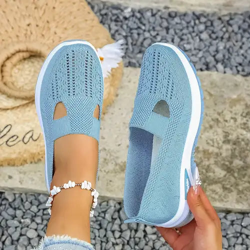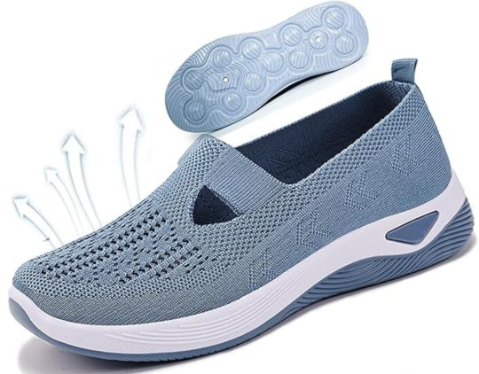 Scarpe sportive in stile sneakers, caratterizzate da un design moderno e confortevole, tessuto elasticizzato, con struttura a maglia che offre una buona comodità, traspirabilità e flessibilità, facili da indossare, colore blu chiaro. La suola bianca con un accento blu navy, dal design ergonomico che garantisce un buon supporto, antiscivolo e ammortizzazione.